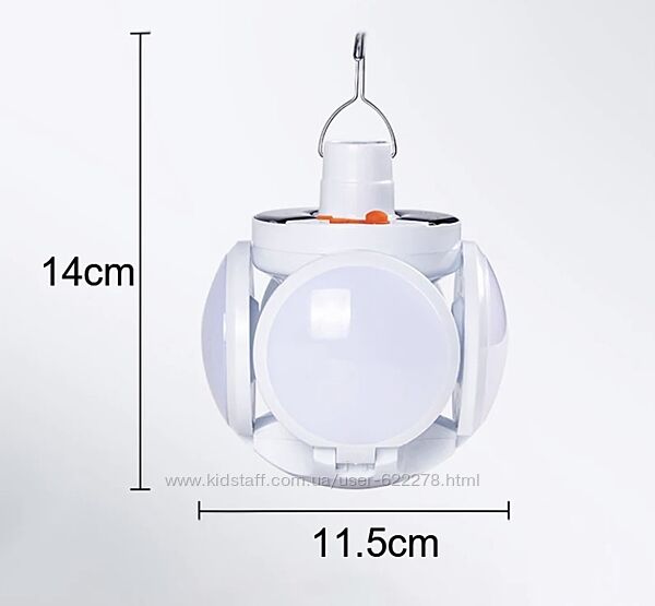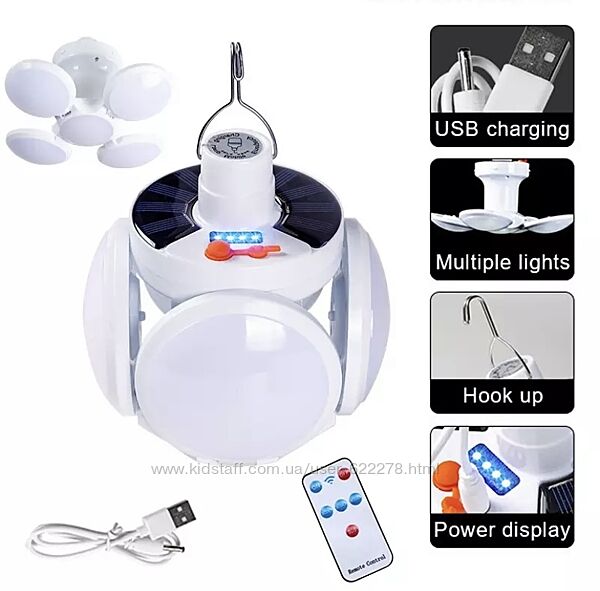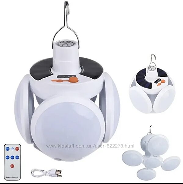 Складная Лед лампа с зарядкой от юсб кабеля, с пультом управления, может заряжаться от солнечной батареи, пять режимов свечения.Есть крючок чтобы подвесить, светит ярко до 6 часов, в зависимости от выбранного режима. Заряжается быстро.