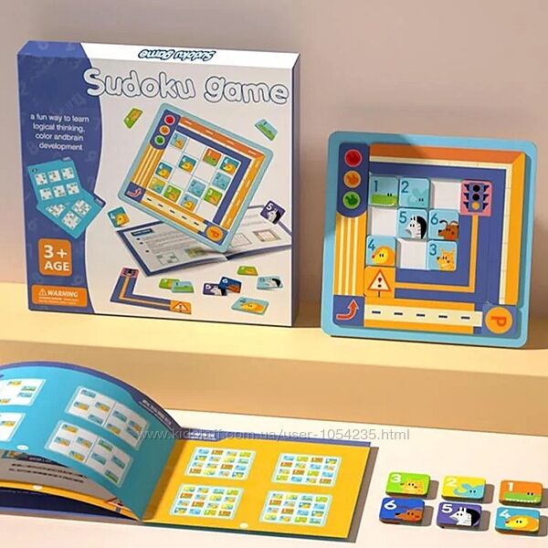 2. Магнитная головоломка: судоку. В наборе плотное магнитное игровое поле на 36 клеточек, есть три магнитные уголка, чтобы закрывать лишние клеточки, и таким образом, поле можно сделать на 16 клеточек или на 9 клеточек в зависимости от сложности, которую вы хотите предложить ребенку для решения. Также в наборе 36 магнитных квадратиков с изображением животных, все квадратики пронумерованы, поэтому легко разобраться, сколько животных необходимо использовать в игре в зависимости от количества клеточек. Есть книжечка с заданиями и с ответами к ним, всего 47 заданий, все задания разделены по уровням сложности и по количеству используемых в игре клеточек. Возрастная категория 3+. Цена: 400 грн.
