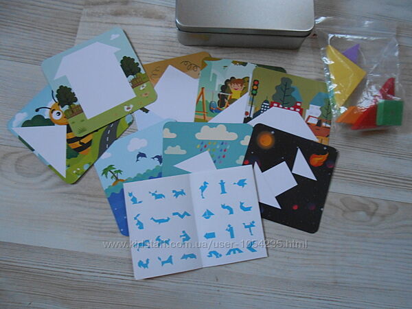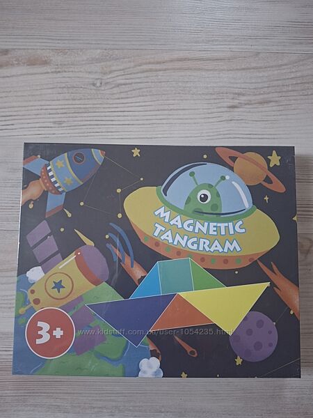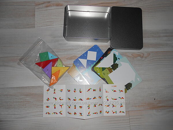 3. Магнитный танграм. В наборе 7 деревянных частей танграма с магнитами. 5 треугольников разных размеров и цветов,квадрат и ромб. Книжечка, в которой 48 заданий по сборке танграма в цветном изображении,где четко видно, какого цвета и формы и куда необходимо поставить, чтобы получить необходимую фигуру. 48 заданий с изображениями в синем цвете, при сборке таких заданий,ребенку нужно хорошенько подумать, из каких фигур составить нужную картинку. 8 небольших двусторонних карточек,где вместо пропусков, нужно вставить данный фрагмент с помощью кусочков танграма. Благодаря жестяной коробочке, кусочкам танграма с магнитами,все изображения можно складывать прямо на коробочке. Цена: 350 грн.
