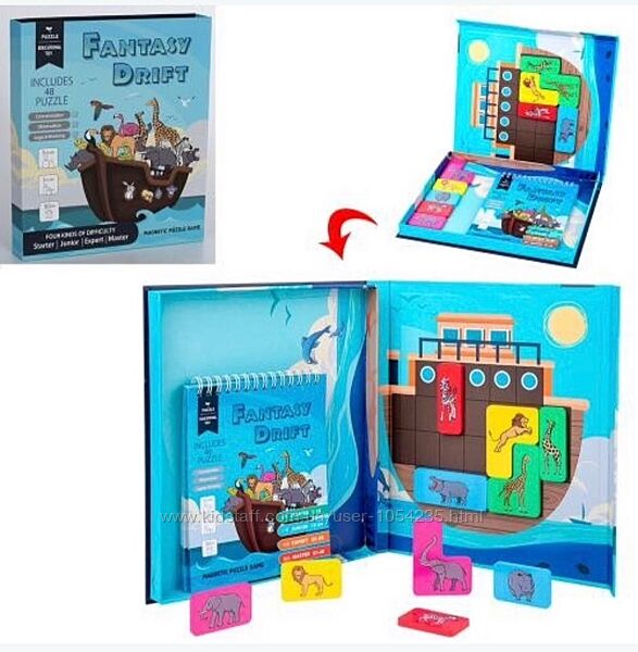 4. Магнитная головоломка "Ковчег". В комплекте книга с заданиями разных уровней сложности (48 заданий). Часть животных располагаем так, как указано в задании, потом добавляем животных, которые остались, обязательно парами. Нельзя, чтобы кто-то из животных выглядывал за пределы ковчега, все животные должны располагаться не вверх ногами. Решая головоломки, ребенок тренирует логическое и пространственное мышление. мелкую моторику, воображение и усидчивость. Игра рассчитана на одного игрока. Возрастная категория 3+. Цена: 350 грн.
