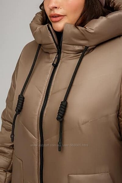 Демісезонне пальто прямого силуету з плащової тканини, що застібається на двосторонню блискавку. Рукав втачний, двошовний із внутрішнім манжетом з рібани. Висота капюшону регулюється за допомогою шнурка з декоративним плетенням. По поличці виконані накладні кишені, ускладнені елементами декору. Внизу виробу, у рельєфних швах полиці, розміщені функціональні блискавки. Температурний режим: -7 °C.