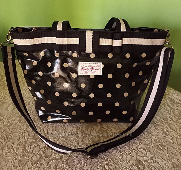 Класна, стильна жіноча сумка чорного кольору в бежеві горохи. Виготовлена з тканини з покриттям ПВХ. Всередині котонова підкладка. Розміри: ширина знизу 28 см, зверху 43 см, висота 28 см, дно 27 смх16 см, довжина ручок 52 см, довжина ременя через плече 122 см ( регулюється). Стан ідеальний, недоліків і дефектів немає.Другие объявления продавца