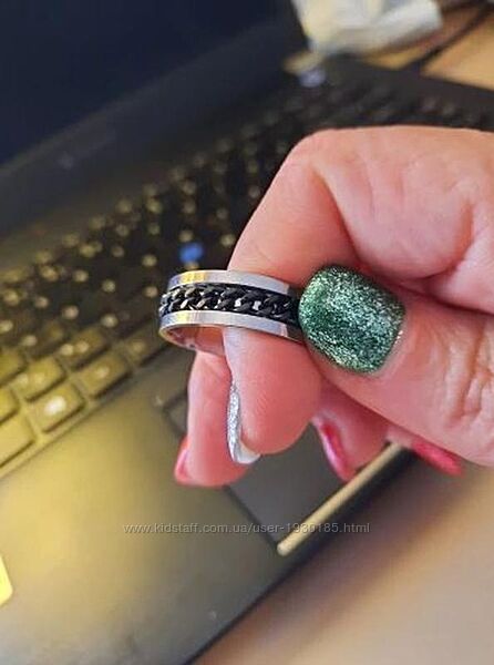 Кольцо выполнено из нержавеющей стали 316L, ширина украшения 8 мм, стального цвета, со вставками из цепочки черного цвета. Цепь подвижная, крутится.В наличии кольцо с черной цепью 8 размер 18.5 мм диаметр