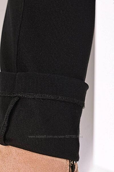 Женские трикотажные штаны в мелкий рубчик, к низу заужены. Пояс со шлевками, застежка на молнию и пуговицу. По бокам - имитация карманов назмейке ( карманы не активные).