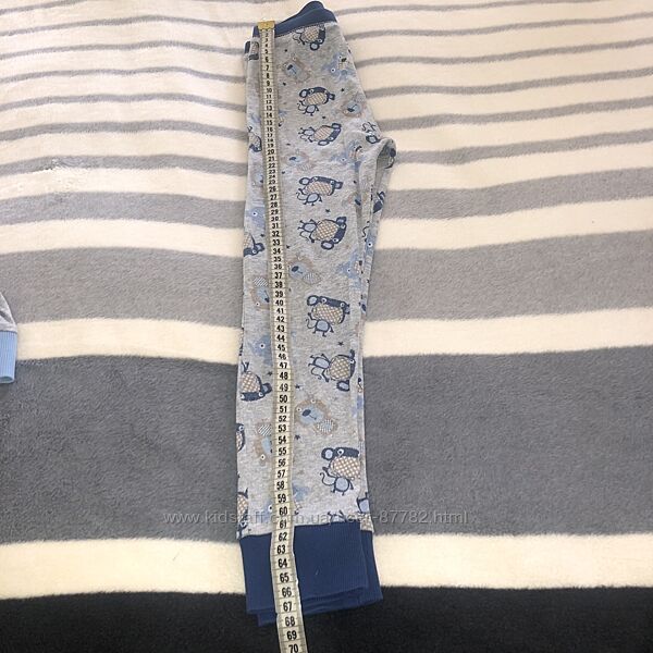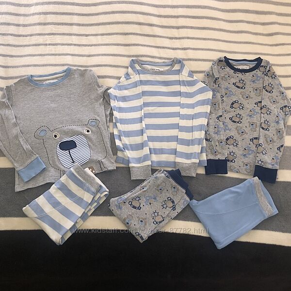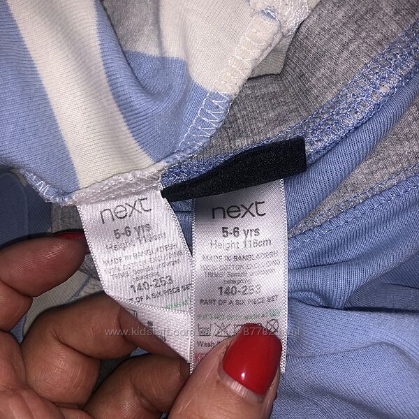 Комплект піжам Next на 5-6 років зріст 116 см.В відмінному стані, тільки на одних штанцях були маленькі стрілочки, акуратно зашиті. На фото показала .