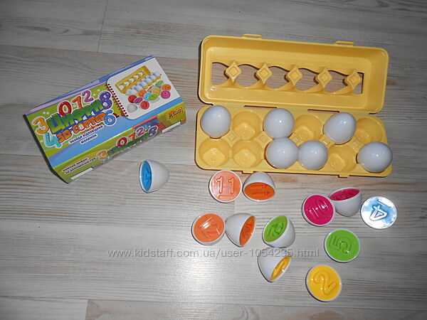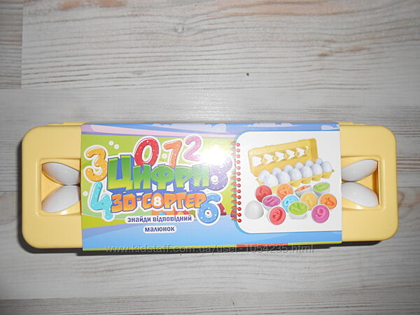 2. Сортер яичный лоток "Цифры". Раннее развитие ребенка невозможно без развивающий игрушек. Набор яичный лоток по методике Монтессори поможет развить у любознательного малыша ловкость рук, мелкую моторику, а также научит его комбинировать предметы по цветам и формам.Внутри каждого яйца спрятано 3D изображение цифр, сердцевинки раскрашены в яркие уникальные расцветки, компактная коробочка в виде лоточка для яиц,все предметы выполнены избезопасного гипоаллергенного пластика. В лотке 12 яиц,размер лотка 28х7х10 см. Возрастная категория 3+. Цена: 350 грн.