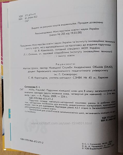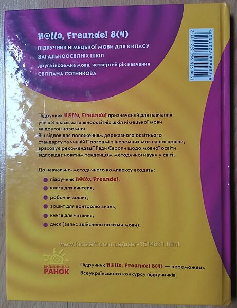 Сотникова С. І.Hallo, Freunde!: Підручник німецької мови для 8 класу загальноосвітніх навчальних закладів (друга іноземна мова, четвертий рік навчання). - 2-ге вид., випр. і доп. - Х.: Ранок, 2009. - 224 с. - 150 грн.