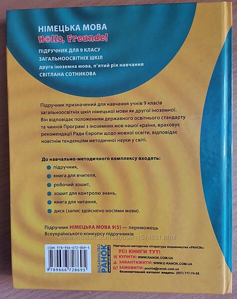 Німецька мова: Підручник для 9 класу загальноосвітніх навчальних закладів (друга іноземна мова, п´ятий рік навчання): "Hallo, Freunde!": / С. І. Сотникова. - 5-е вид., випр. і доп. - Х.: Ранок, 2013. - 224 с. - 200 грн.