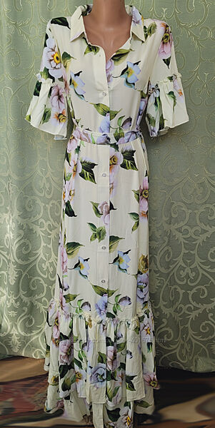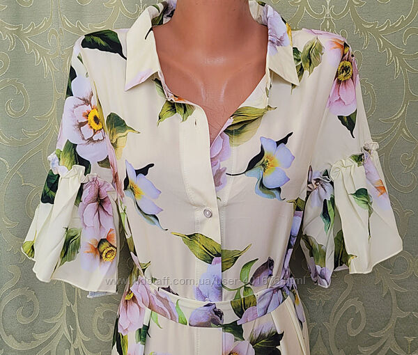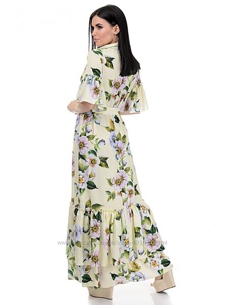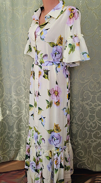 354Длинное летнее платье «в пол» на пуговицах. Дублированный рубашечный воротник и планки под пуговицы задают четкие линии, а широкие рюши на рукавах и по низу - добавляют нотки романтизма. Ткань софт очень мягкая, эластичная и приятная, а яркие принты создают прекрасное летнее настроение на весь день. В комплект входит пояс.