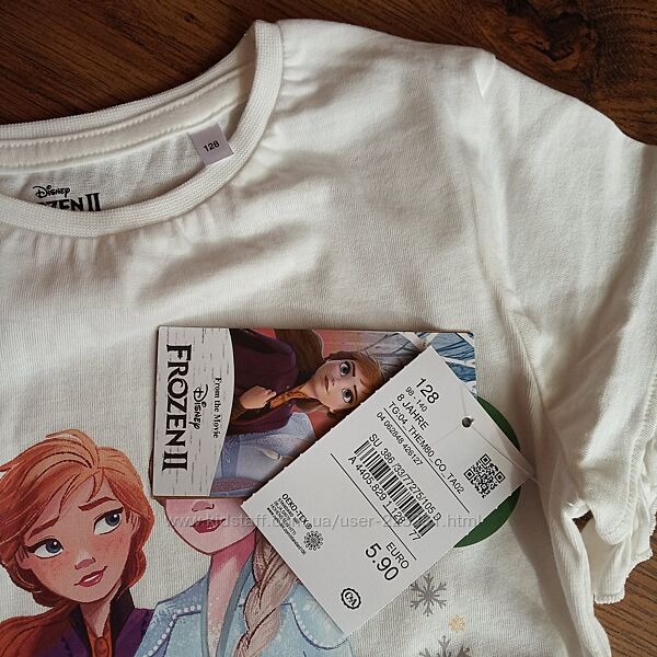 1. Футболка C&A з мультяшним диснеївським мотивом Frozen II, сестричками з Эренделла, Ельзою і Анною, р. 128 (8 років), колір - білий. 100% органічний коттон.
