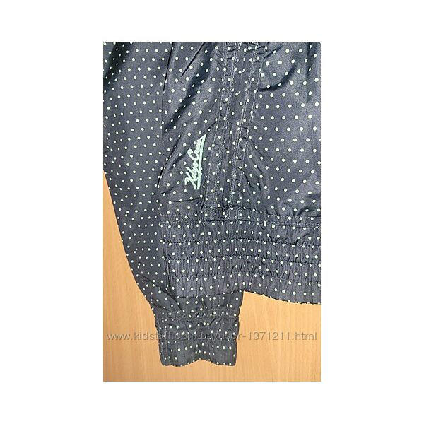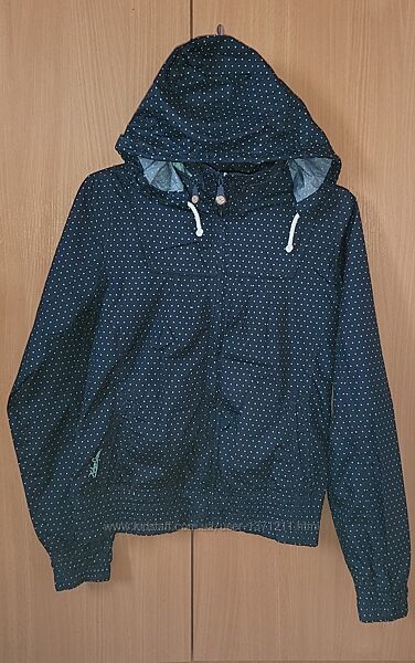Стан ідеальний, легкий і зручний, капюшон складається в кишеню ворота, підкладка текстиль, дві зовнішні та одна внутрішня кишеня, рукави та низ курточка на резинці, колір темно синій у дрібний салатовий горох.Розмір вказаний S, mex 26, це приблизно рост до 156 см.