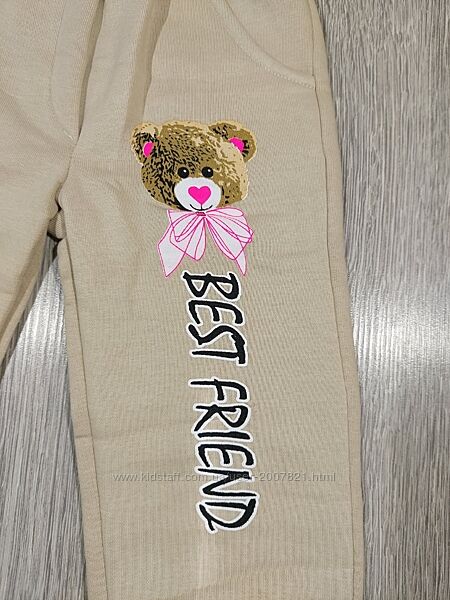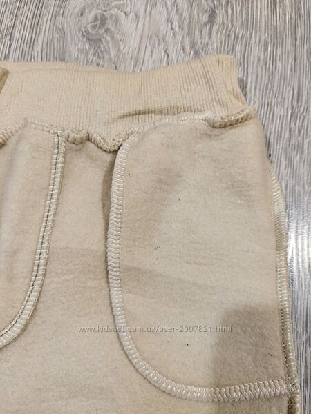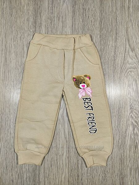 Спортивні штани для дівчинки. Колір бежевий. Всередині фліс. На поясі широка гумка. Знизу манжети. По бокам кармани. Вік 2, 3, 4 років. Виміри:2 роки- Пот 23 см, стегна 33 см, довжина виробу 49 см, крок 28 см.