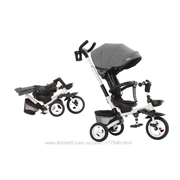 Швидко збирається без інструментів. Компактно складається в декілька рухів. Великий капюшон з трьома секціями та із світловідбивною стрічкою; Батьківська ручка з регуліровкою по висоті та підсклянником; М´яке сидіння з обертом на 360, регуліровкою відстані від керма. М´яка перегородка проти сповзання. М´яка спинка з регулюванням нахилу одним натиском; Триточкові ремені безпеки; Зносостійкі гумові колеса (8 дюймів задні, 10 дюймів переднє); Маленький кошик на рулі та велика кишеня за сидінням; 2 підніжки. Максимальне навантаження: 25 кг Розміри ящика - 61 * 43 * 35см