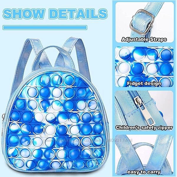 Дитячі рюкзаки з дизайном Fidget Toys】 Передній міні-рюкзак має поп-дизайн, який може ефективно знімати стрес, яскраві кольори та милий дизайн підходять для дівчаток.【Поп-рюкзак та непосиди-іграшки】Це не лише іграшка для непосиди, яка знімає стрес, але й може використовуватися як рюкзак для малюків, поп-гаманець, міні-дорожня сумка чи непосида-іграшка для мобільних телефонів, гаманців, ключів та інших речей ,Міні-рюкзак з регульованим ременем для дітей,легкий і зручний для транспортування.【Безпечний матеріал】Рюкзак для малюків Pop виготовлений із високоякісного силікону, міцний і легко чиститься, його нелегко пошкодити, діти весело проводять час, граючи, не турбуючись.【Випадок】 Розмір цієї сумочки для дівчат становить 7,8*2,3*7,4 дюйма. Ідеально підходить для дівчаток, дітей, багатофункціональних для дитячого садка, відпочинку на природі, спорту, кемпінгу, походів, подорожей тощо.【Різдвяний подарунок】Симпатичний дизайн і практична дорожня сумка. Дуже підходить як подарунок дітям і друзям під час канікул, сувенірів на день народження дітей, Різдво, Хелловін, День подяки тощо.240