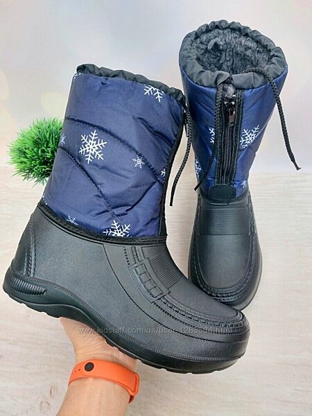 Теплі практичні черевики чорно-синього кольору на штучному хутрі з піни! Легкі та комфортні(inlove) Матеріал- піна, плащівка Всередині тепле штучне хутро Висота - 27 смЗроблено в Україні