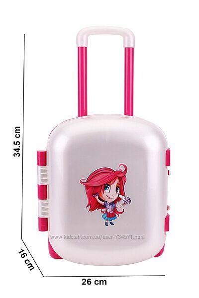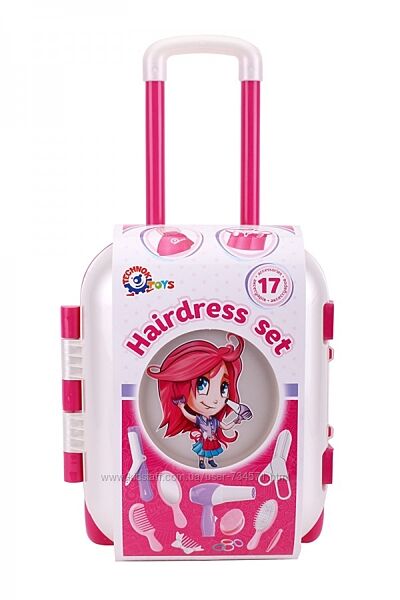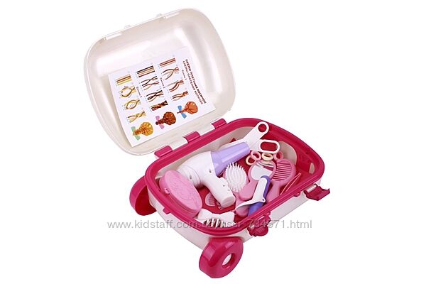 Комплектация: чемодан, фен, плойка, расческа, щетка, зеркальце, 2 заколки, пудреница, пинцет, ножницы, накидка, пояс, 4 резинки для волос, инструкция для заплетания.