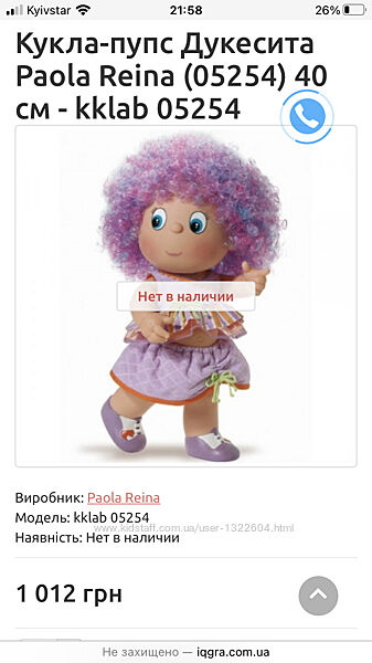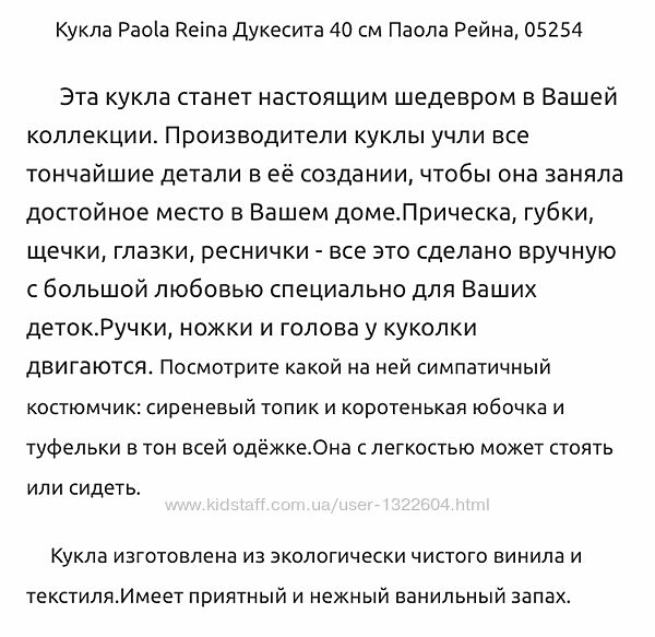 Колекційна лялька в чудовому стані. А ще вона дуже смачно пахне).Основные характеристики Артикул 834 Страна-производитель Испания Высота куклы 40 см. Рекомендации Возраст 5, 6, 7, 8 Пол Для девочек Paola Reina Созданная известным испанским брендом Paola Reina кукла Дукесита отличается высоким качеством и изготовлена из экологически безопасных материалов. Очаровательная мимика, большие удивленные глаза, кучерявые сиреневые волосы, симпатичная легкая одежда — во всех деталях куклы отражается ее уникальность и неповторимость. Особый шарм куклам Paola Reina придает приятный легкий ванильный или фруктовый аромат. Материал: кукла изготовлена из винила, глаза из прозрачного твердого пластика, волосы сделаны из высококачественного нейлона. Качество игрушки подтверждено нормами безопасности EN17 ЕЭС.