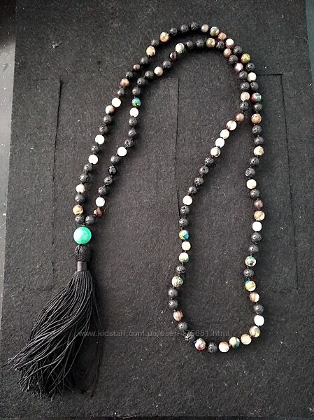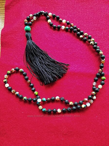 Лареат з дрібних намистин із художнього скла, каменя і шовкової кисточки.Довжина у складеному вигляді 41 см.+9 см.