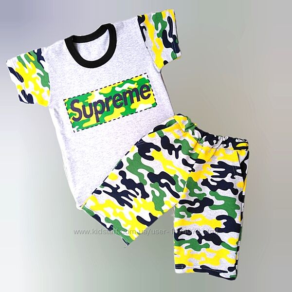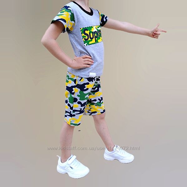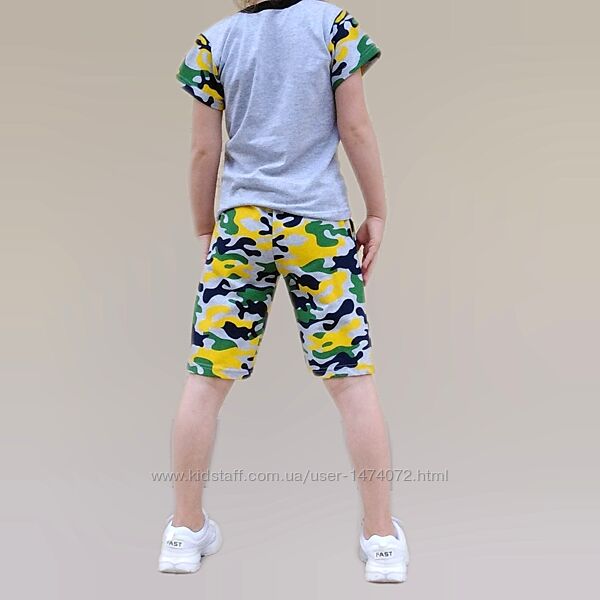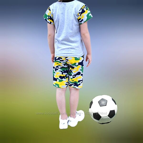 футболка : Довжина 43 см; Плечі-26 см ПОГ-31 см; Шорти: довжина/крок 36/20; гумка 22 см, стегна 34 см - 5шт