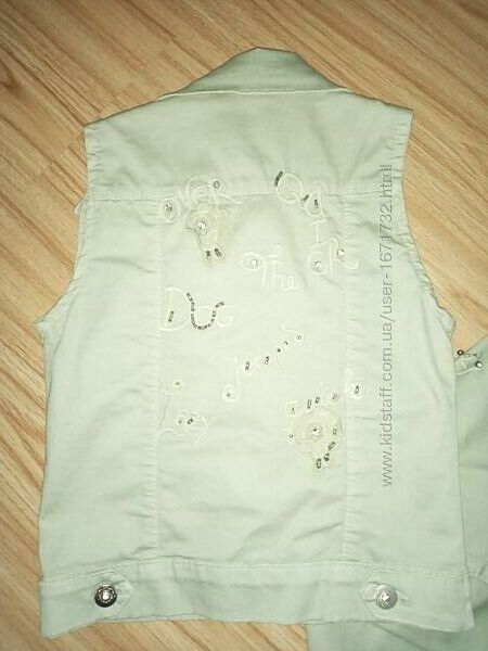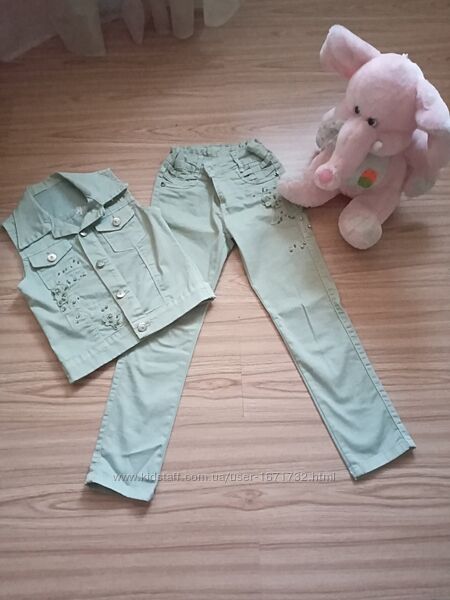 Продам очень красивый и модный костюм двойку : джинсы и джинсовая жилетка цвета хаки. Джинс средней плотности, приятный к телу. Можно носить весной и летом.Замеры жилетки: длина 41см, пол.обх.груди 34 см. Внутри есть запасная пуговица.