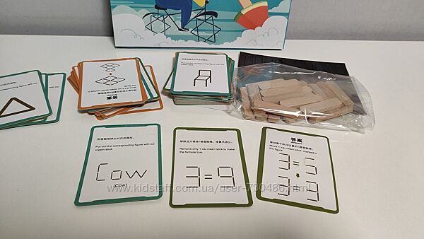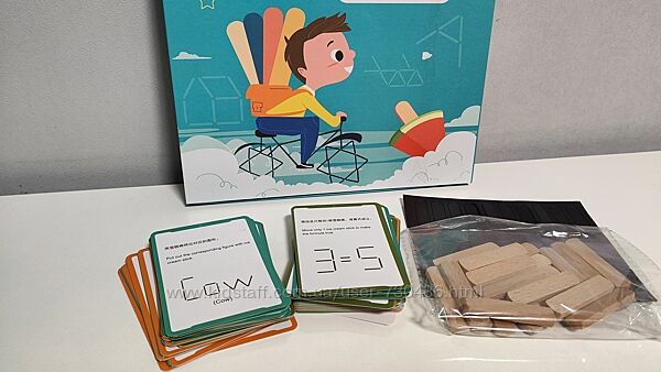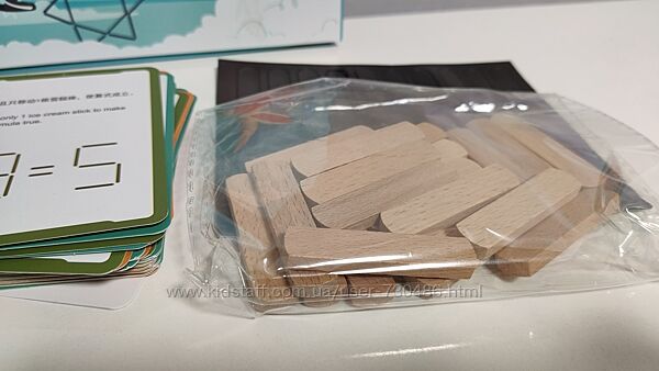 Комплектація: папка з магнітним робочим полем; дерев´яні палички 20 шт; магнітики для паличок; картки з завданнями (двосторонні) - 59 шт.