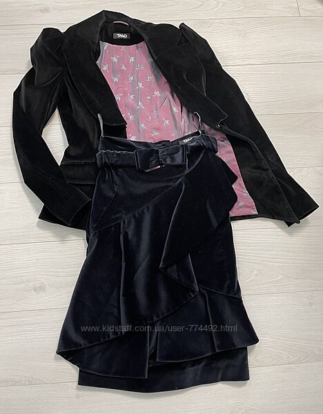 Юбка велюр бархат Tago (Украинский бренд премиум качества) р.36 XS-S. Стильная, воланы держат форму, отдельно пояс с бантом на заклепках. Бархат идеального качества, не дешевый Китай, под юбкой подклад атласный. Цвет темно синий, практически черный. В составе эластан, чуть потянется. Длина 61 см, талия 34 см, будок 42-42 см. Идеал, одета пару раз на мероприятия, к сожалению поправилась, мала.К юбке есть пиджак, покупала отдельно, но одевала как костюм. По цвету чуть чуть контраст, если очень присматриваться. Юбка отдельно 850. Комплектом 1500