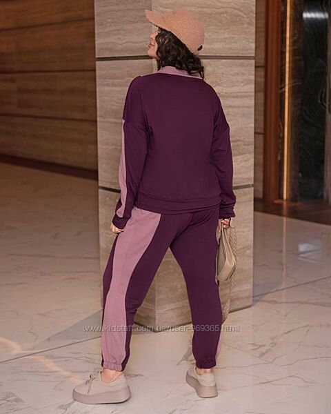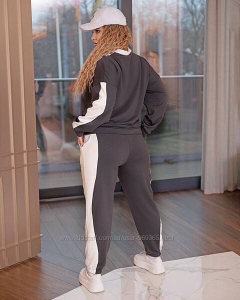 Світшот супер модного крою, спереду з вставкою на грудях і застібається на блискавку. Штани з боків з ексклюзивними вставками, з кишенями, на резинці і манжетами, висока посадка. Супер якість! Ультрамодний і зручний костюм у модних відтінках зробить вас неперевершеною.