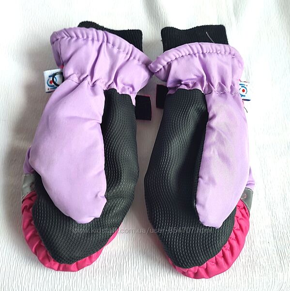 Варежки рукавицы детские зимние, краги сиреневые (размер 4-5 лет)Фирменные варежки. Бирки нет, поэтому не могу указать бренд. Изготовлены из качественной плащевой ткани сиреневого цвета, на термоутеплителе. По ладони и большому пальцу нескользкие накладки. По верху перчаток светоотражающие вставки. По запястью поясок на липучке. Трикотажная резинка не допустит попадания снега в варежку.