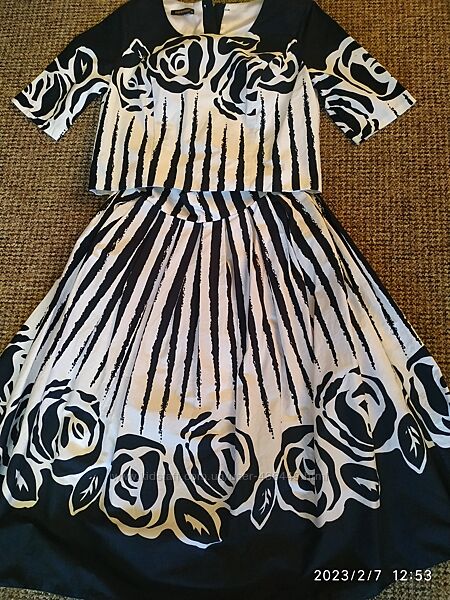 Красивый, элегантный юбочный костюм, р.38, подойдёт на 44-46, ткань хлопок, пышная юбка и укороченный топ, сзади на пуговичках, костюм в новом состоянии. Отправка укрпочтой или Новой, обмена, возврата нет