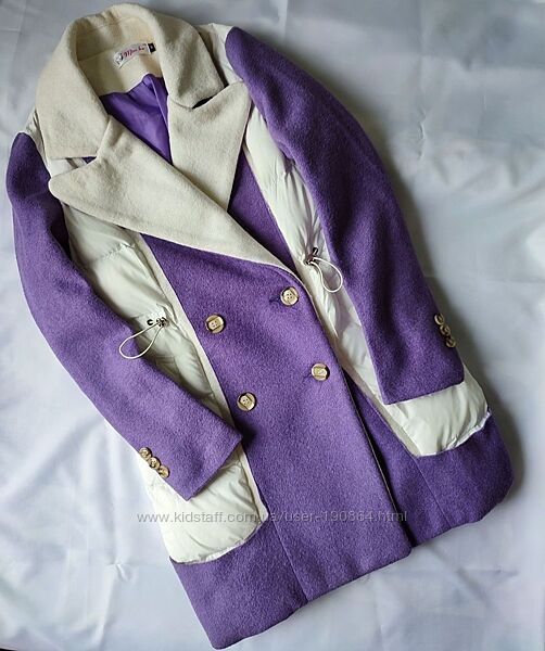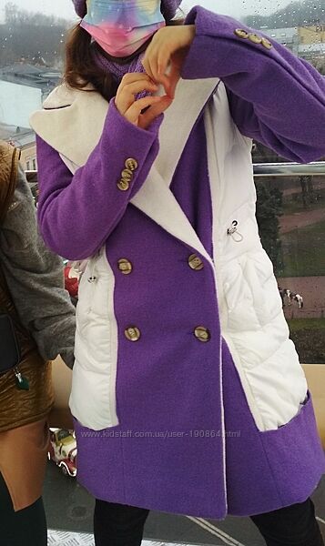 Оригінальне комбіноване пальто міді (хутряне пальто + плащівка з утеплювачем як у пуховика).Колір фіолетовий з білим. На підкладці. Тепле (на зиму та холодну осінь).
