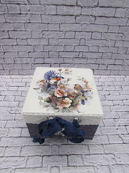Скринька прикрашена накладками, стразами, мереживом, металевим ланцюжком.Для зручності є маленька ручка на якій прикріплений бантик із стрічки шебби.