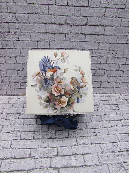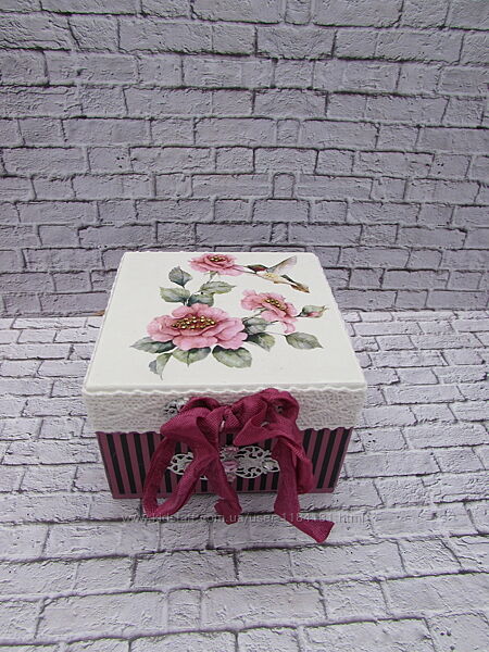 Маленька скринька з МДФ, декорована в техніці декупаж.Не дивлячись на маленькі розміри, в ній можна зберігати не лише дрібницю (біжутерію, резиночки та заколочки), але й солодощі.