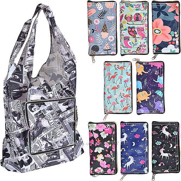 фото 1 Складна сумка - це відмінна альтернатива недовговічним поліетиленовим пакетам. Компактно складається в гаманець. У складеному вигляді сумка не займає багато місця і її зручно носити з собою в жіночій сумочці. Сумка виконана зі зносостійкого матеріалу на основі ПВХ. озмір 40 * 38 см з урахуванням ручки 40 * 60см, в складеному вигляді 18 * 10см.