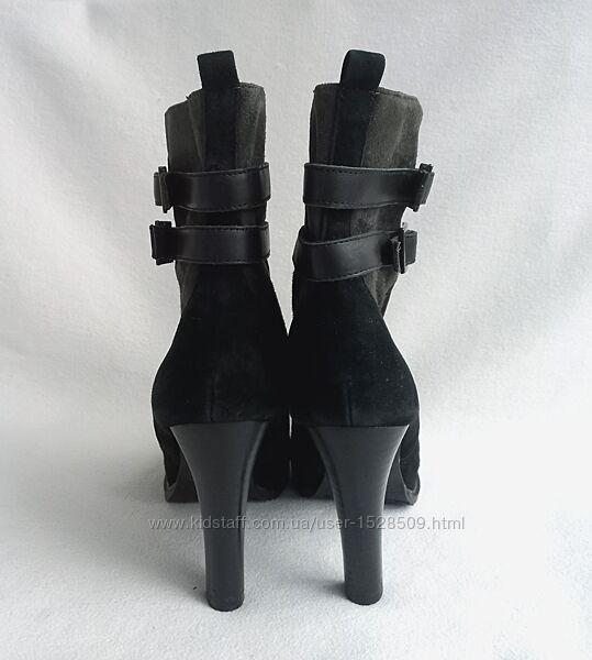 Демісезонні чорні з корічневим напівчоботи з натуральної замші Avant Premier. Застібки немає, всередині шкіряна підкладка. Вживані акуратно, стан дуже добрий, потертостей зовні та всередині немає, дивиться фото.Розмір вказаний 40, довжина устілки всередині 26,5 см, ширина 8 см, каблук 10 см. Окружність верху 30 см.