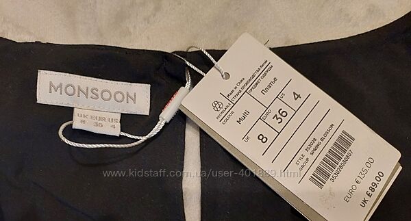 Продам нове брендове плаття Monsoon, р.36. З дорогої колекції, ціна в магазині 135 євро. Дуже гарна кольорова гама, якість супер. 97% котон та 3% еластан. Спереді гарний квадратний виріз декольте. Підклад підшитий до плаття. Ззаду акуратна розпірка. Зверху гудзик та схована блискавка збоку.Довжина 106, пояс 36, ширина під мишками 42
