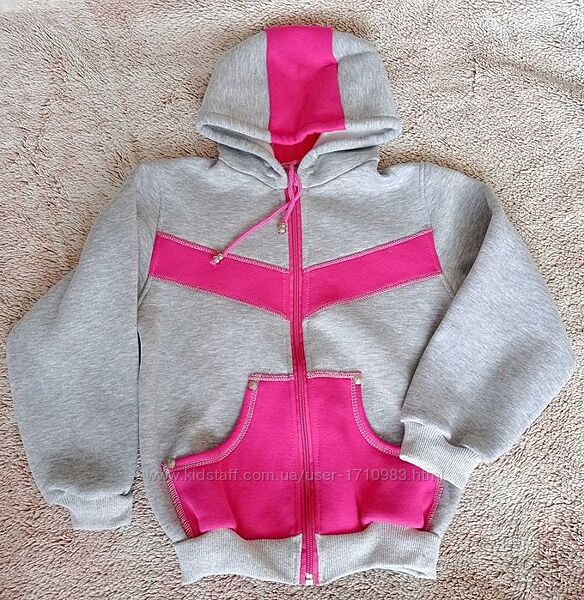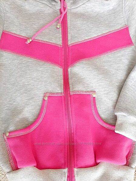 Толстовка на блискавці та з капюшоном. В капюшон вставлена шнурівка. Наявність двох накладних карманчиків.