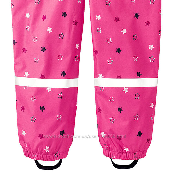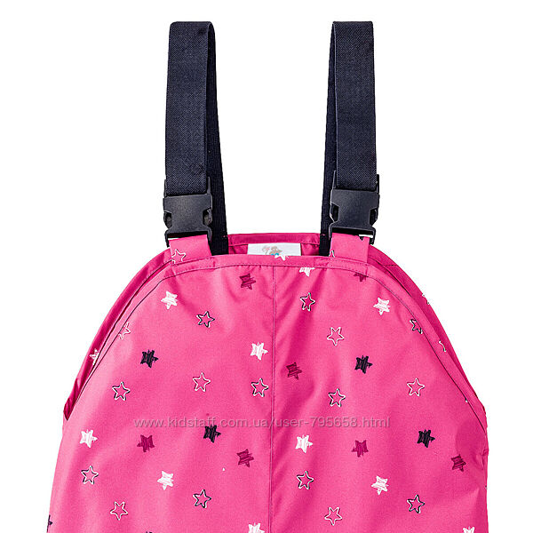 весело під дощем! Рожеві дощові штани з принтом зірок. З регульованими та еластичними підтяжками та стійкою застібкою-кліпсою. На еластичних ніжках закінчуються світловідбиваючі елементи і перемичка. На талії з боковими кнопками для регулювання ширини. Всередині підкладка темно-синього кольору. Вітро- та водостійкий. Водонепроникні шви і оснащені світловідбиваючими елементами.