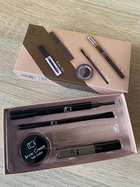 Набір LCF для брів. До складу входить 4 одиниці: олівець, туш для брів, крем 2-х кольоровий та щіточка. Все як в оригінальному наборі, окрім прозорого гелю. Тон 02 - темно коричневий Тон 01 - світло коричневий Ціна 100 грн.