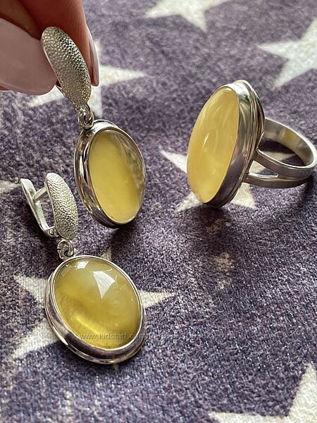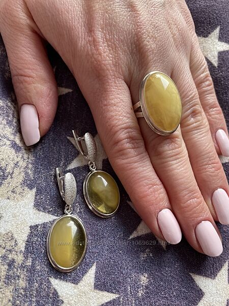 Срібний комплект з натуральним бурштином. Сережки та кільце (розмір 17,7).Гарна ціна.