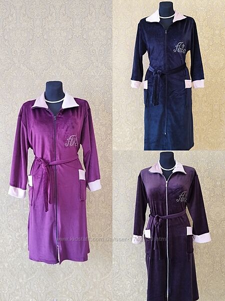 Подробное описание: Женский велюровый халат на молнии с карманами и поясом