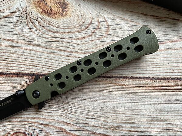 Шершавая пластиковая рукоять Cold Steel Ti Lite IV с двумя рядами отверстий часто подвергается кастомизации. Её исполняют из самых разных материалов, но (что важно) её форма, внешний абрис и полнота практически всегда близки к оригиналу. Это только подтверждает сбалансированность и удобство изначальных форм. Ti Lite IV больше подойдет правше - здесь использован Liner-Lock (его удобнее складывать правой рукой) и не переставляемая клипса.