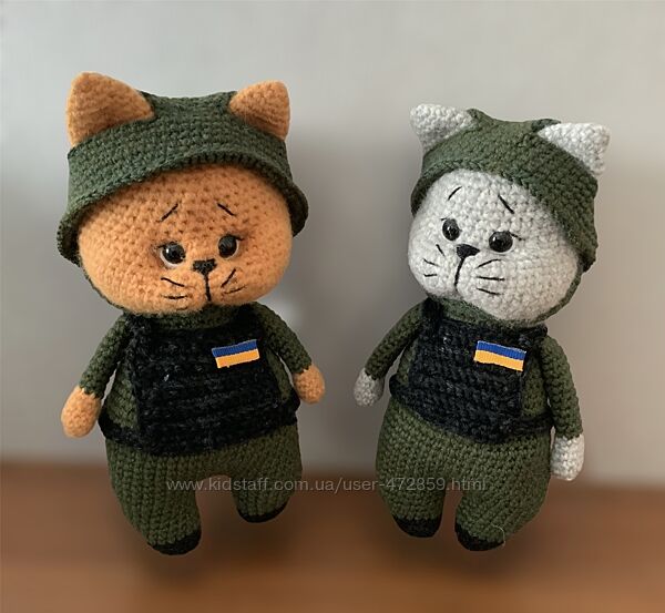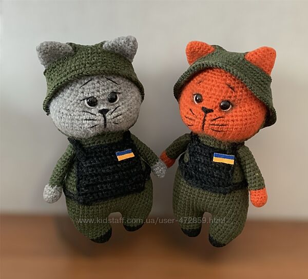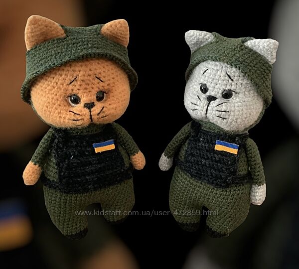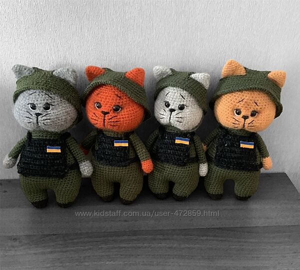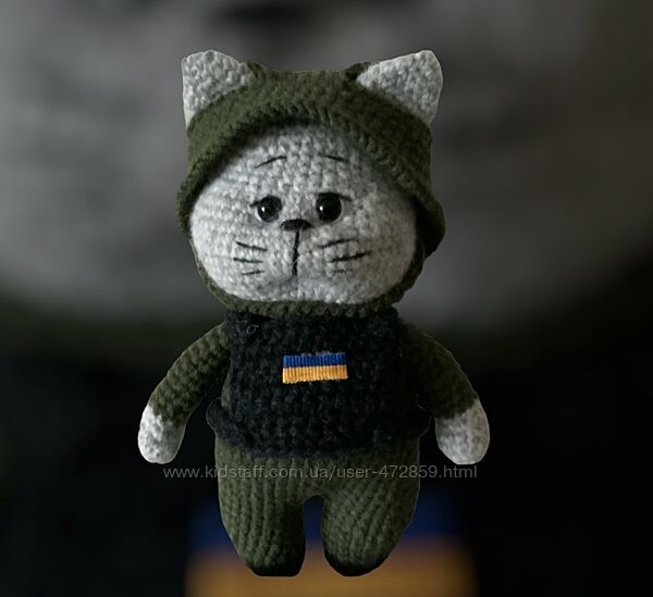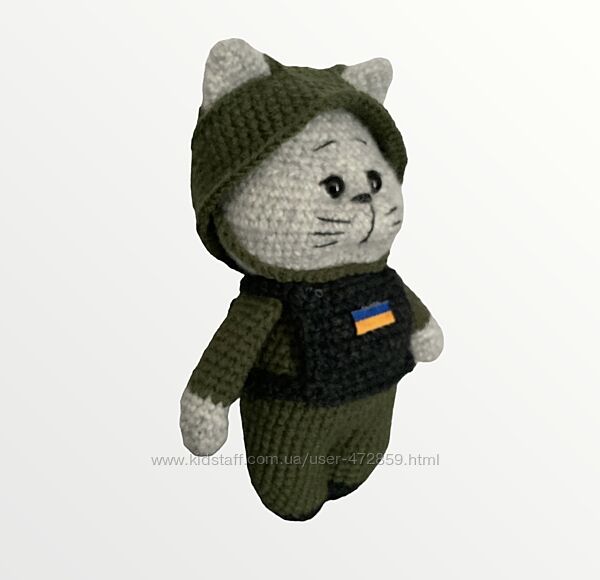 Іграшка ручної роботи виготовлена в техниці в‘язання гачком.Котик-патріот в камуфляжі, бронику та в шоломі ( шолом знімається).