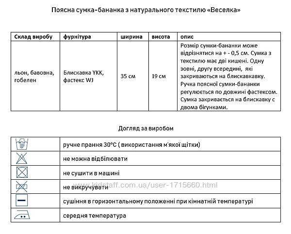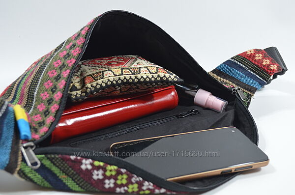Сумка з текстилю має дві кишені. Одну зовні, другу всередині, які закриваються на блискавкавку. Ручка напоясної сумки-бананки регулюється по довжині фастексом. Сумка закривається на блискавку з двома бігунками. При відправці виріб упаковується в крафт-коробку.