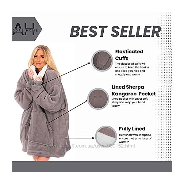 Велика ковдра з капюшоном Adore Home, суперм’яка та затишна толстовка з капюшоном, дуже велика підкладка з шерпи