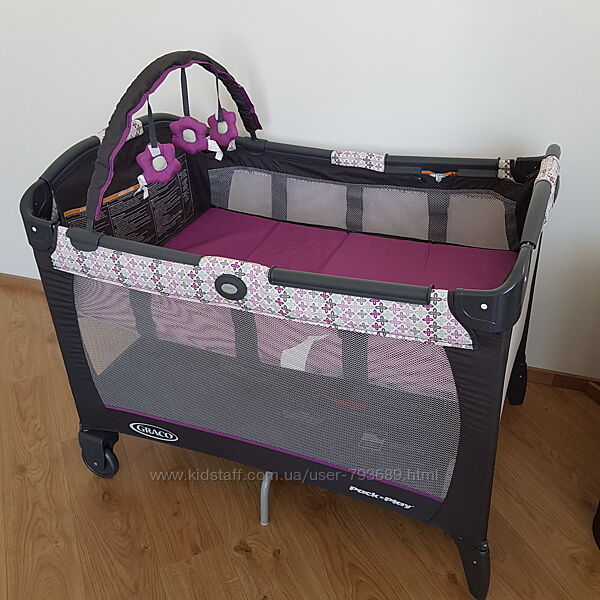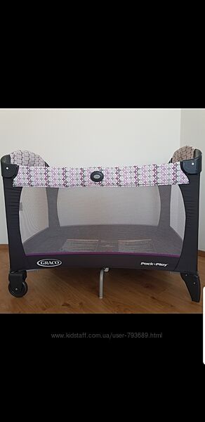Манеж-кровать от известной фирмы Graco модель Pack ´n´ Play в состоянии нового. Отлично подойдет для сна и игр Вашего малыша. Легко складывается и раскладывается, благодаря чему его легко брать с собой в поездку или на отдых. Кроватку можно использовать от рождения ребенка и до 4-х летнего возраста (до 15 кг). Может использоваться как дома, так и на улице. Идеально подходит для малогабаритной квартиры.Манеж имеет 2 уровня (второй уровень предназначен для детей до 9 кг или когда ребенок начнет садится сам или становиться на коленки). Оснащен пеленальным столиком, который может использоваться до 15 кг. Дуга оснащена игрушками, что позволит Вашему ребенку весело проводить время. Две ножки оснащены бесшумными резиновыми колесами, что позволяет без шума перемещать манеж. Боковины манежа изготовлены из прочного прозрачного материала, что позволяет постоянно наблюдать за ребёнком. Манеж-кроватка Graco компактна в сложенном положении, что очень удобно для переноски и транспортировки. Замок-фиксатор, который защищает от произвольного складывания. Изготовлен из прочных антибактериальных тканей, удобных для чистки. Хлопковая ткать с особой пропиткой не промокает.