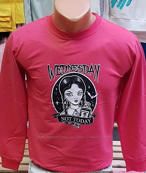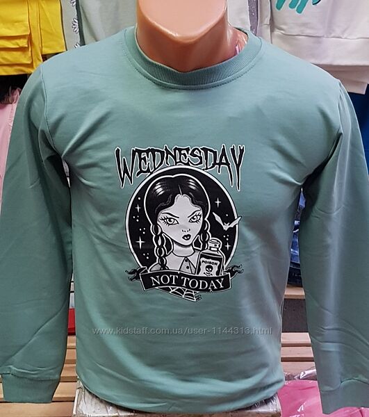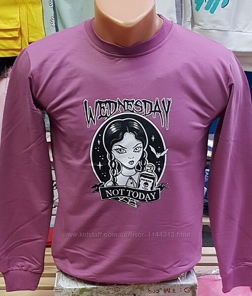 Реглан на дівчину з малюнком із популярного серіалу Wednesday на зріст від 122 до 152. Реглан з турецького трикотажу середньої щильності, тканина стрейчева. Низ виробу та рукавів на манжеті. Склад тканини: 95% бавовна, 5% лайкра. Виробник: Туреччина.припустима похибка в замірах +-1см