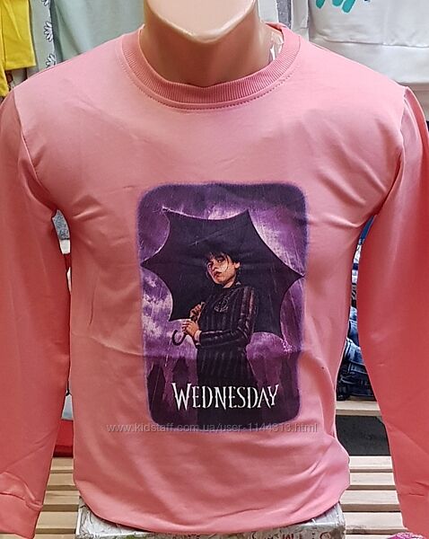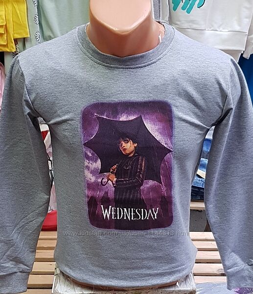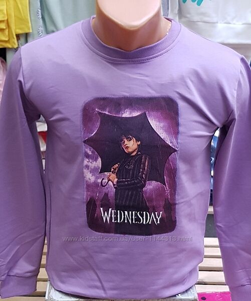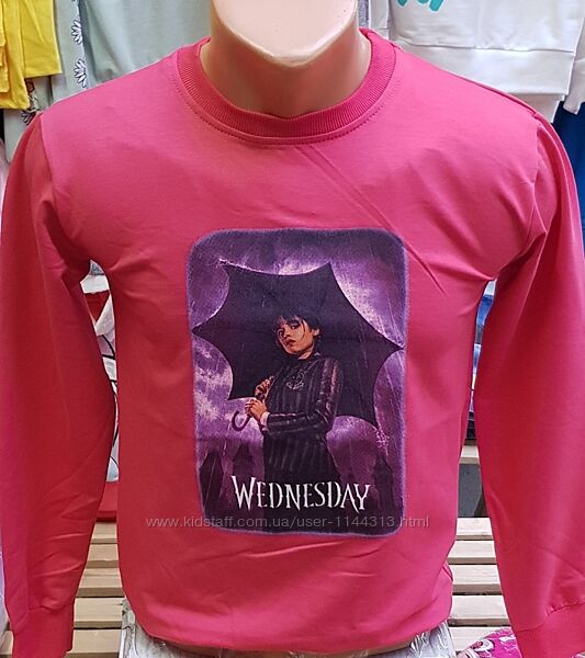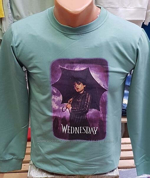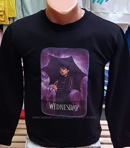 Реглан на дівчину з малюнком із популярного серіалу Wednesday на зріст від 152 до 176. Реглан з турецького трикотажу середньої щільності, тканина стрейчева. Низ виробу та рукавів на манжеті. Склад тканини: 95% бавовна, 5% лайкра. Виробник: Туреччина.припустима похибка в замірах +-1см