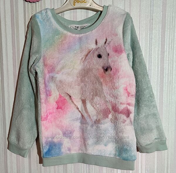 М´ятна тепла толстовка H&M з конем у розмірі 5-6 років.Стан відмінний, м´яка і ніжна.
