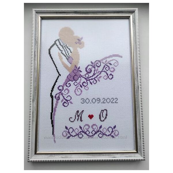 Подарунок молодятам на весілля чи річницю, наприклад ситцеву. Символічна метрика з датою одруження та ініціалами молодих.Ручна вишивка хрестиком. Формат А4. Оформлення в раму за додаткову оплату за домовленістю.