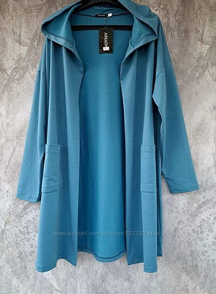 Женский трикотажный костюм-тройка: кардиган-мантия прямого кроя, имеются накладные карманы, плечи приспущены. Пояс штанов на резинке, имеются боковые карманы.Стана-производитель: Украина (ТМ ARIADNA)